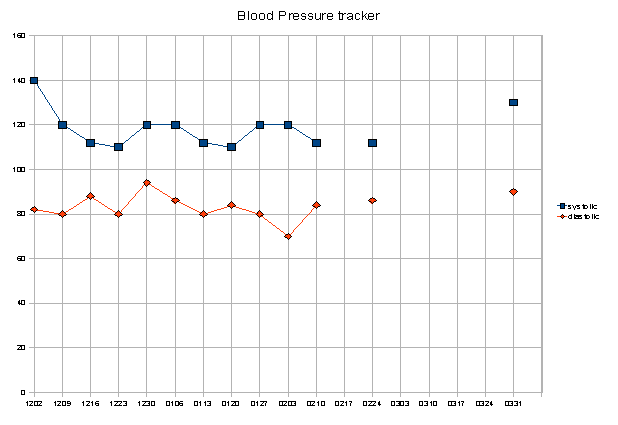 More disturbingly, my blood pressure crept back up a bit. It’s not any cause for worry as of yet. Part of the issue might just be that I got checked at a later time than usual; BP is known to be somewhat dependent to time-of-day and such. (I attended a later class than usual due to a school commitment.) The doctor doesn’t seem worried and he didn’t put me back on ramipril, so it’s probably not an extremely bad development, but it warrants keeping an eye out.
