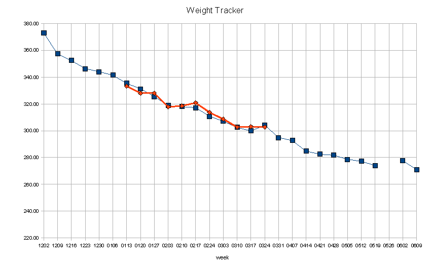NB: I’ve recalibrated a bit here to use the original weight as measured by PWMC (373 lbs), since that’s where I’m getting my weekly numbers.