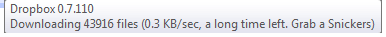 dropbox is one of my favorite “cloud” utilities. It keeps a directory synchronized across many computers, allowing remote access and automatic backup. Whenever you set up dropbox on a new computer, all of the files need to be copied across. As you might imagine, this can take some time. Usually, dropbox pops up a little balloon telling you how many files are left and about how long it will take. But if you are syncing a huge amount of data…