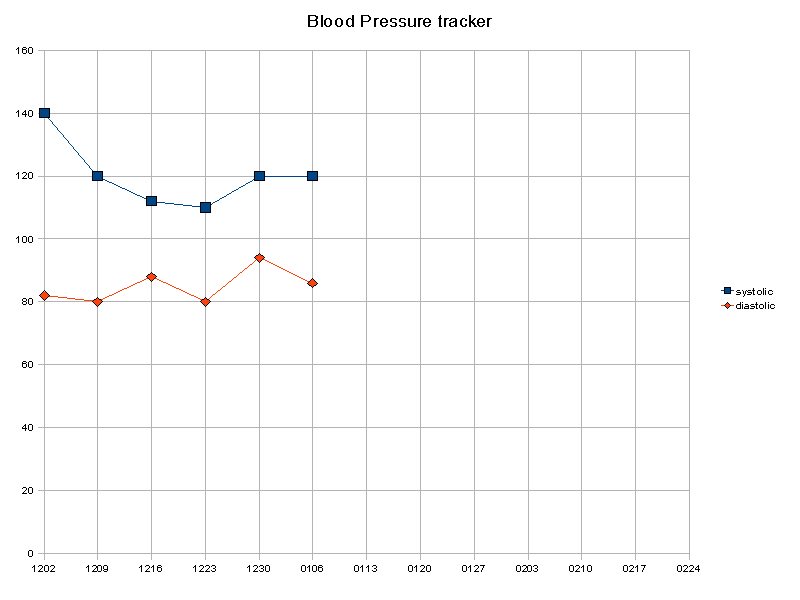 My blood pressure hardly changed at all, which was disappointing after several weeks of strong improvement. Of course 120/86 is still better than 180/120(!) and even than 120/90, though barely. My doctor put me back on ramipril last week but it hasn’t seemed to have an effect yet.